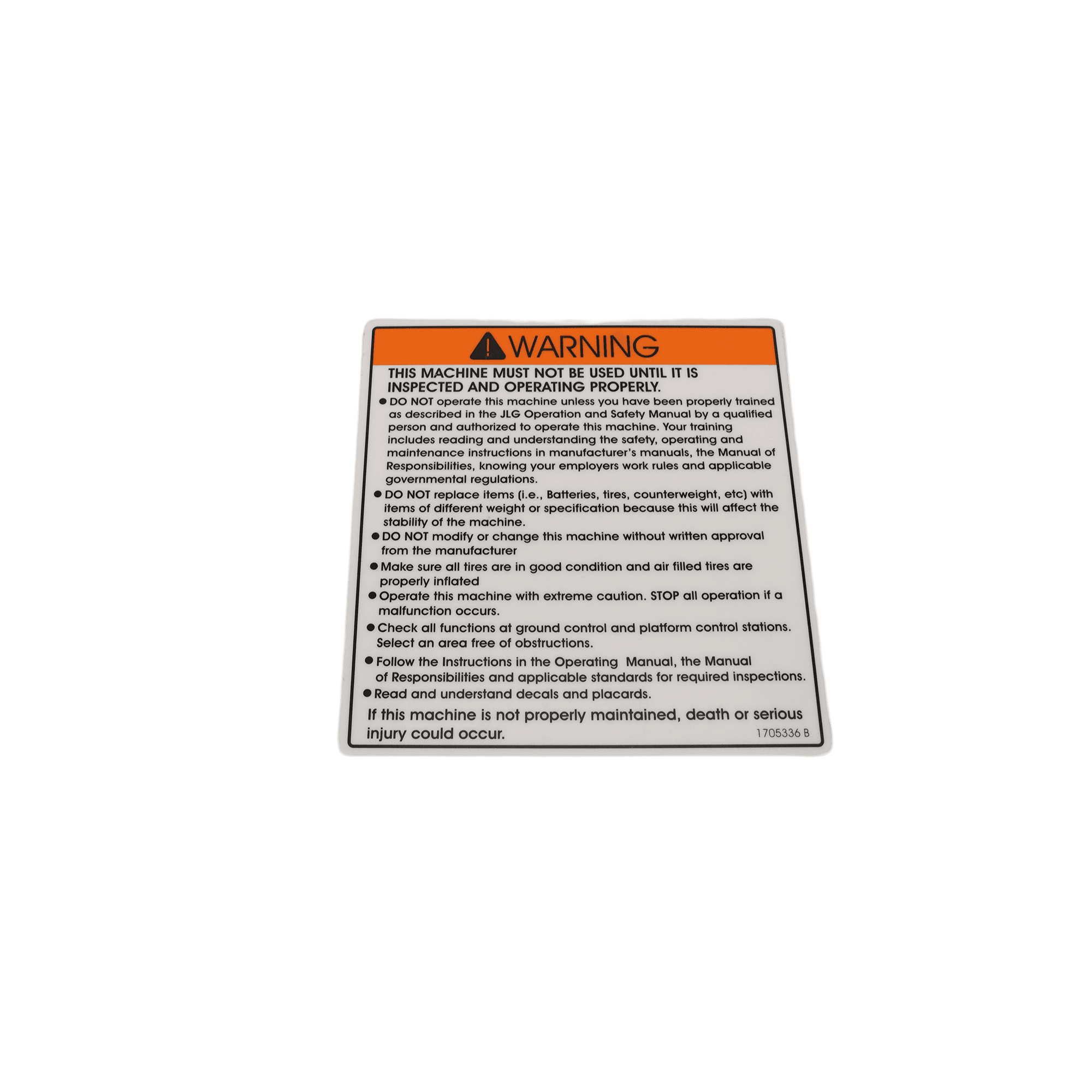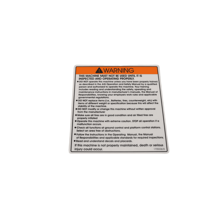 The JLG Decal 1705336 is a must have label for your machine. Providing insights into the dangers of your machine is crucial to avoid any accidents. It has a weight of 0.1 lbs. From preventing delays on your worksite to serious injuries, this decal will keep your worksite running smoothly and on schedule.