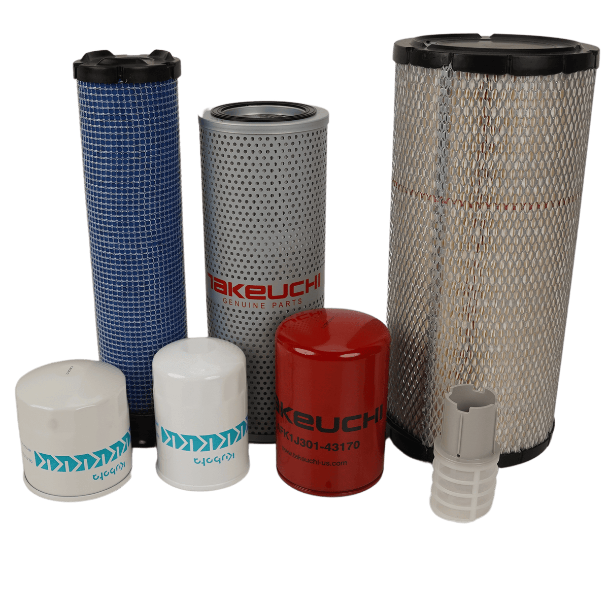 - Bundle Components ["KHH1C0-32430","Takeuchi","Oil Filter","AFK1J301-43170","Takeuchi","Fuel Filter","KHH166-43560","Takeuchi","Fuel Filter","KRD451-51940","Takeuchi","Sediment Strainer","1911262102","Takeuchi","Air Filter","1911262101","Takeuchi","Air Filter","1551103900","Takeuchi","Hydraulic Filter"]